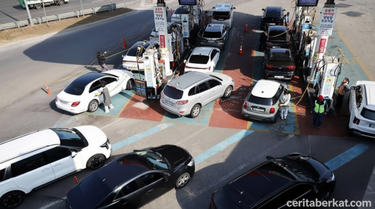 Pada Rabu (4/3/2026), antrean kendaraan terlihat mengular di beberapa stasiun pengisian bahan bakar umum (SPBU) di Seoul, Korea Selatan, saat warga berbondong-bondong mengisi tangki mereka di tengah kenaikan harga minyak global akibat konflik di Iran. Banyak pengemudi menyatakan khawatir kenaikan harga bahan bakar bakal berlanjut dalam beberapa hari mendatang. (REUTERS/Kim Hong-Ji)